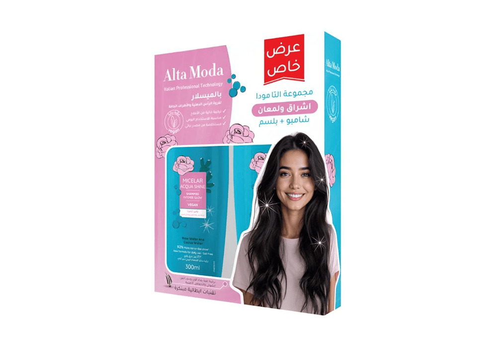 تجمع مجموعة ألتا مودا بالميسلار بين التنظيف العميق والترطيب المتوازن لتمنح شعرك إشراقاً ولمعاناً طبيعيين. تحتوي المجموعة على شامبو وبلسم غنيين بتقنية الميسلار التي تزيل الشوائب بلطف وتترك الشعر ناعماً، خفيفاً ومتألقاً دون إثقاله.