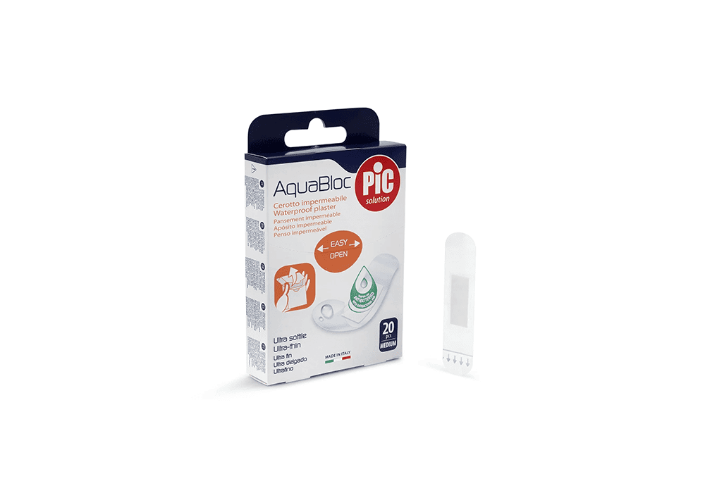 لاصقات Pic AquaBloc مقاومة للماء لحماية الجروح والخدوش الصغيرة بفعالية، مريحة وخفيفة على الجلد، مناسبة للاستحمام.