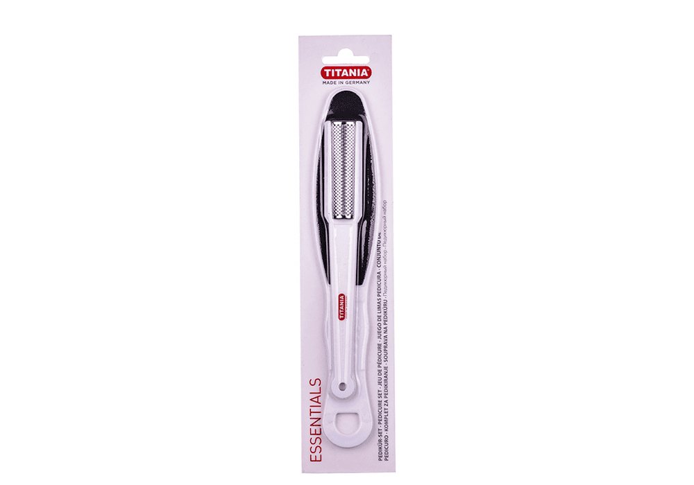 طقم تيتانيا للعناية بالقدم والأظافر يحتوي على الأدوات الأساسية لتنظيف، تقليم، وتنعيم القدمين والأظافر بكل سهولة واحترافية من منزلك.
