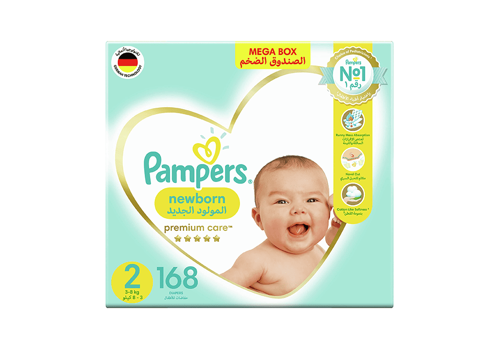 حفاضات بامبرز بريميوم كير المولود الجديد مقاس 2 (وزن الطفل 3-6 كجم) - 168 حفاضة
