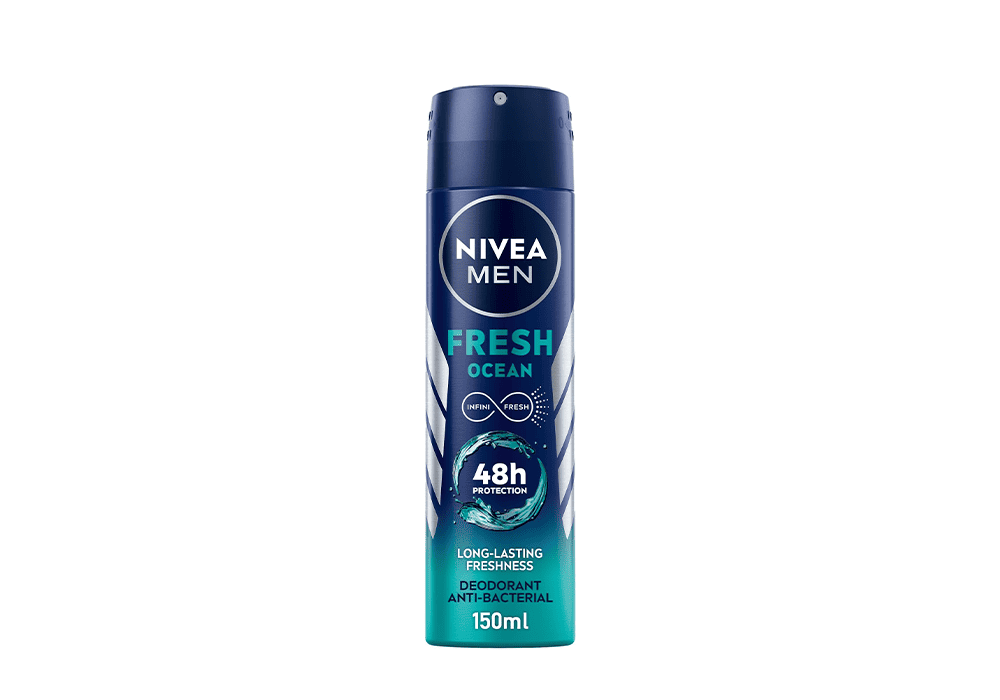 نيفيا مزيل عرق رجالي بخاخ فريش أوشن يمنح حماية فعالة ضد التعرق والروائح الكريهة حتى 48 ساعة، مع شعور بالانتعاش العميق ورائحة منعشة مستوحاة من نسيم المحيط.