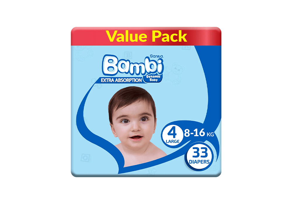 حفاضات بامبي إكسترا أبزوربشن مقاس 4 (وزن الطفل 8-16 كجم) - عبوة 33 حفاضة